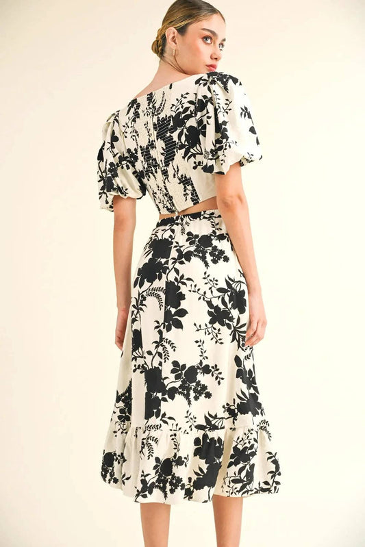 Puff Sleeve Crop Top Black Floral Print Ruffle Hem Midi Skirt Two Piece Set