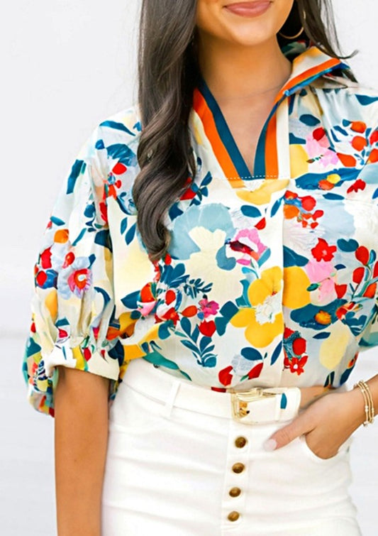 Floral Boho Shirred Bubble Viscose Notch Blouse
