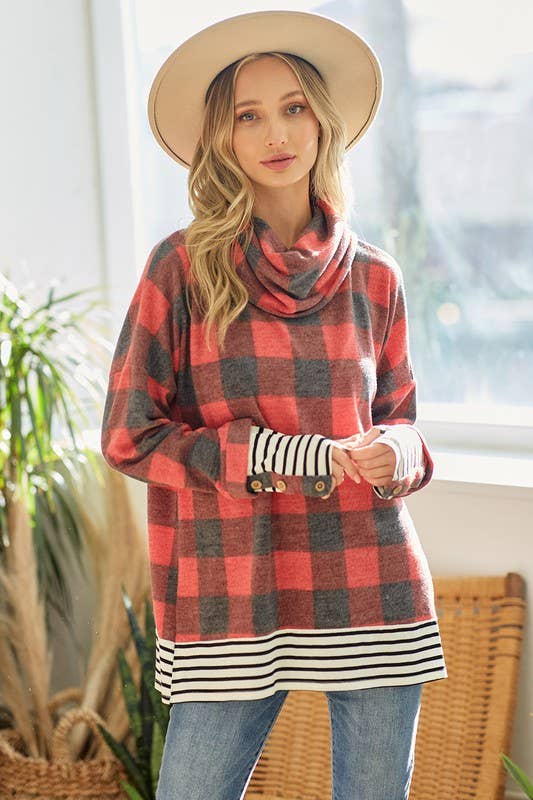 LMT3007-P-Brushed Plaid Cowl Neck Tunic