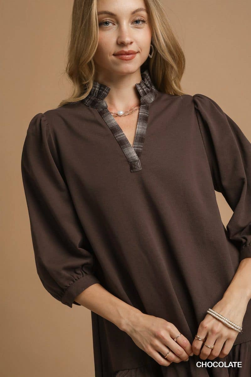 Key Features French Terry V-neck with plaid detail 34 length puff sleeves Flowy ruffle hem with plaid lining peek Relaxed A-line silhouette Not Lined Fit Model Notes Model is 5'9 and is wearing a small All Measurements are approximate Fabric Contents 85% Cotton 15% Polyester