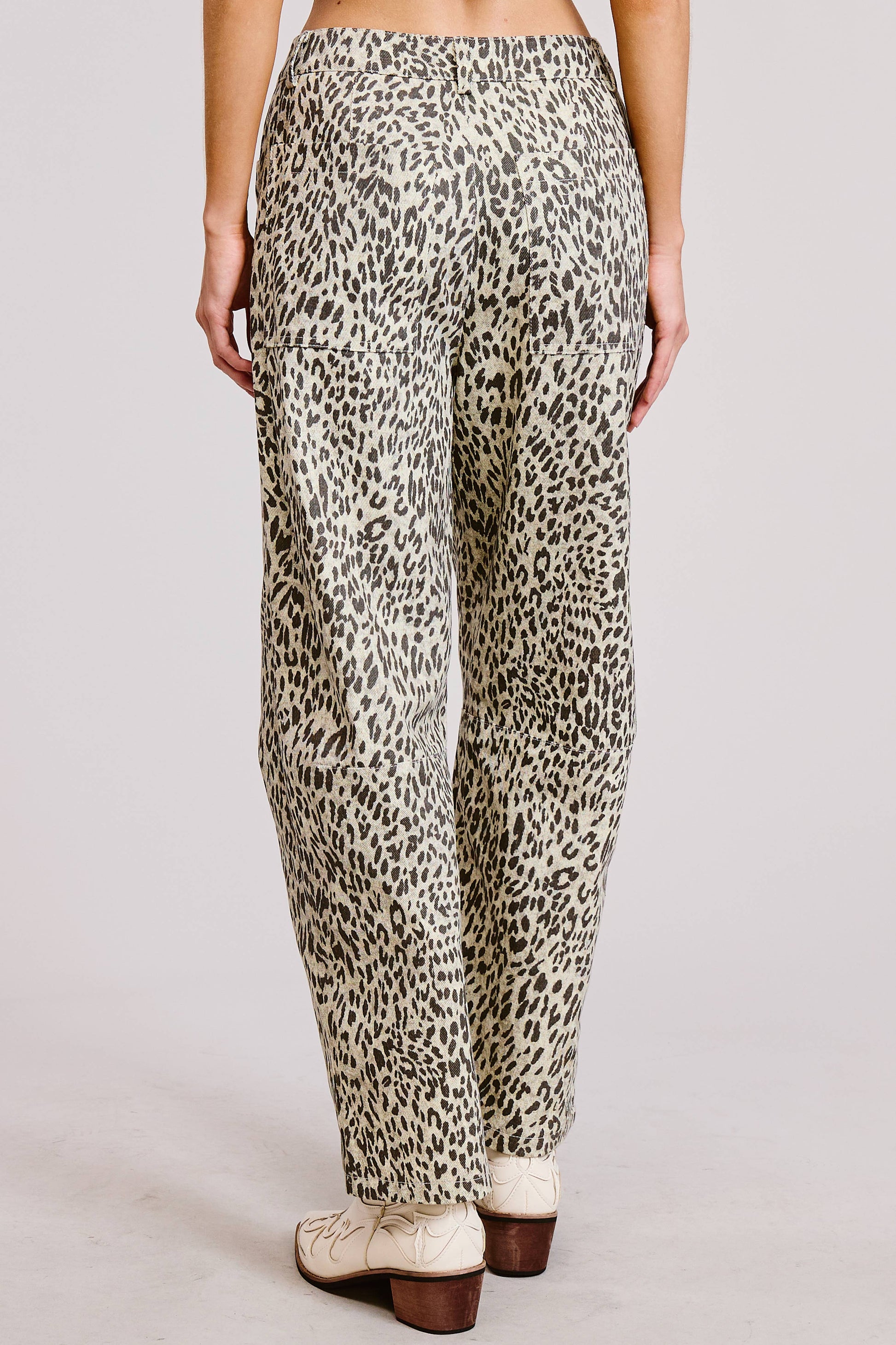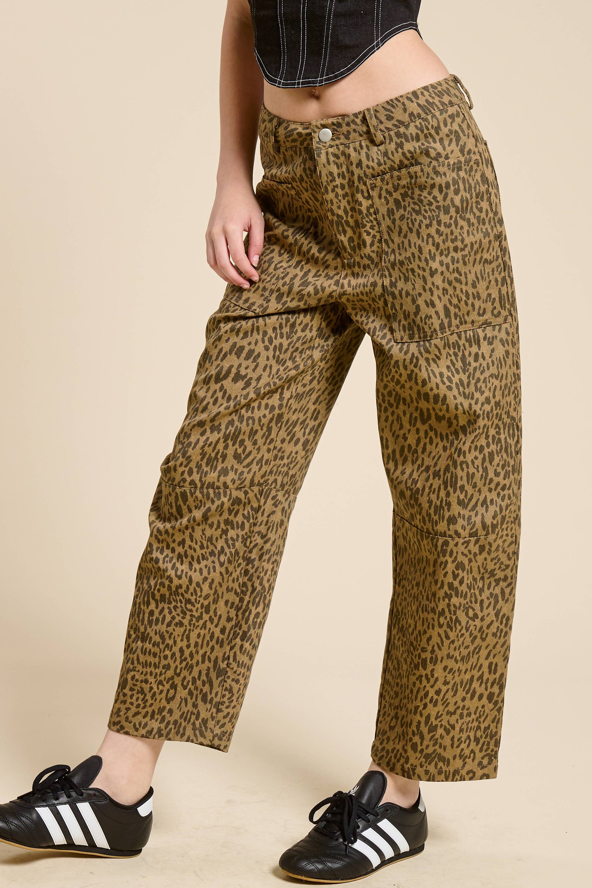 These leopard print denim jeans offer a bold take on classic style. Featuring a low-rise waistband, oversized front square pockets, and seam detailing, these jeans have a relaxed barrel-leg fit that crops at the ankle for a trendy, semi-baggy look. Pair with a tucked-in tee for a laid-back vibe or dress them up for an evening out.
